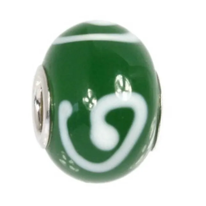 Ein Armband Modul – Glas grün mit Kringel weiß – 925 Sterling Silber, original IMPPAC European Bead! Das Modul hat Gewinde innen.