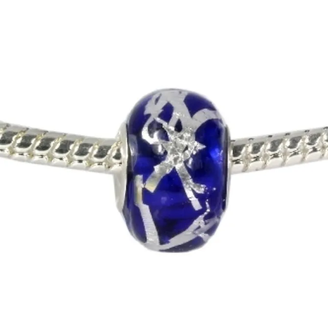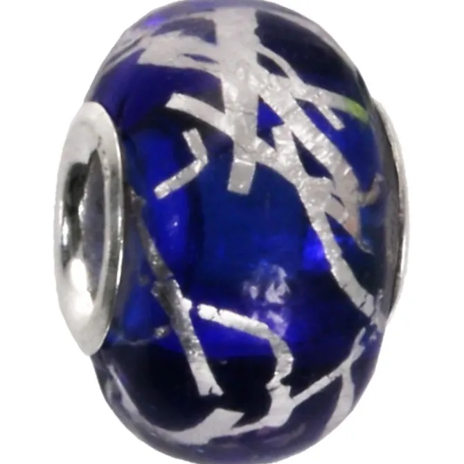 Ein Glas Armband Modul – Blau mit silbernen Streifen – 925 Sterling Silber, original IMPPAC European Bead! Das Modul ist ein Spacer (Slidemodul) ohne Gewinde.