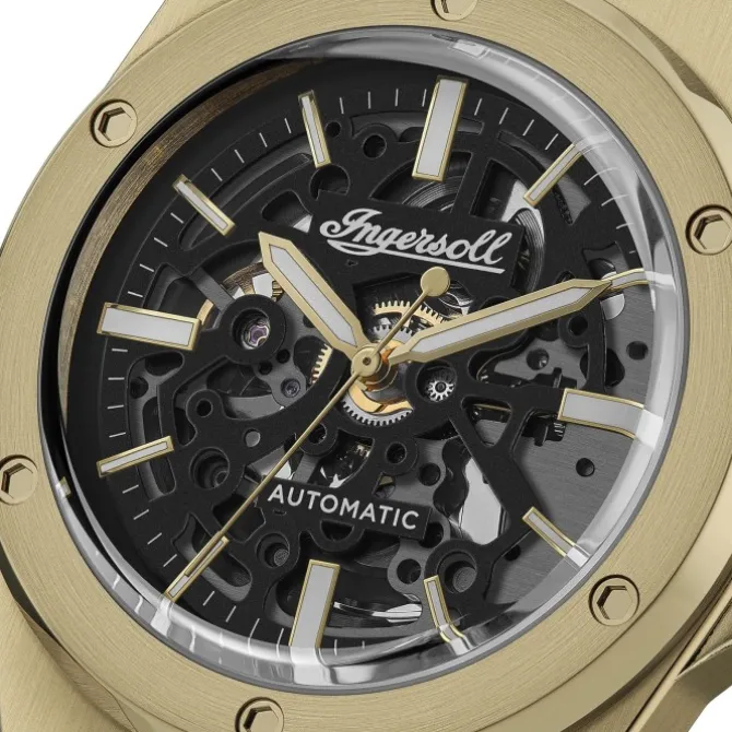 Die Ingersoll -The Baller- Kollektion bietet stilvolle Automatikuhren mit Edelstahlgehäuse und schwarzem Skelettzifferblatt.