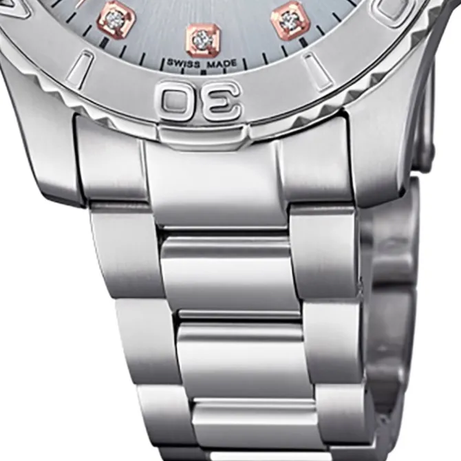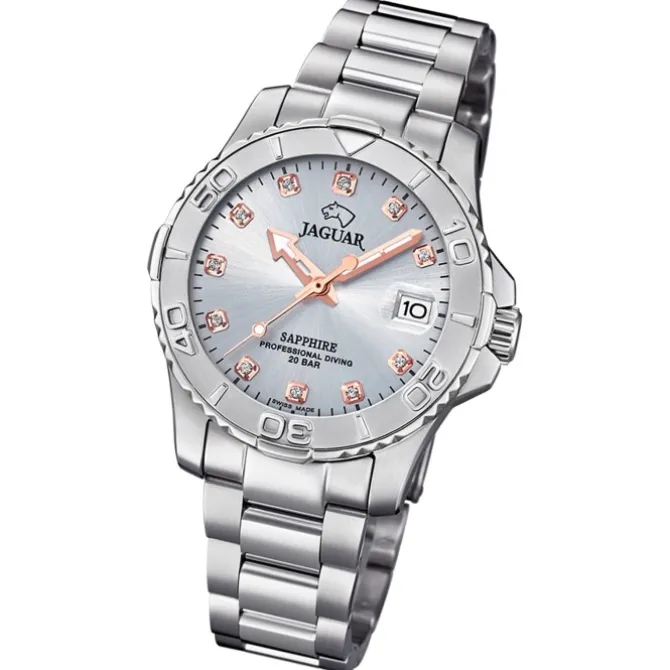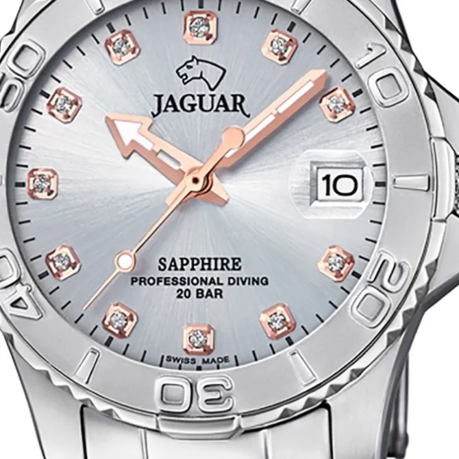 Diese Fashion Uhr für Damen aus der exklusiven Jaguar Cosmopolitan-Kollektion verfügt über ein hochwertiges Edelstahl-Armband in silber. Das analoge Quarzwerk und die Wasserdichte bis 20 bar machen diese Armbanduhr zu einem besonders zuverlässigen Begleiter.