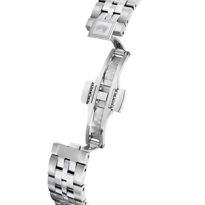 Diese einzigartige Uhr für Damen aus der aktuellen Jaguar Heritage Kollektion garantiert hohen Tragekomfort durch das hochwertige Edelstahl-Armband in silber. Die Armbanduhr mit analoger Anzeige und präzisem Armbanduhr ist ein zuverlässiger Begleiter in Alltag und Freizeit.