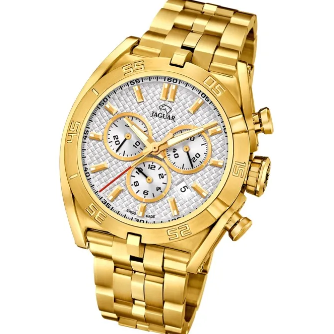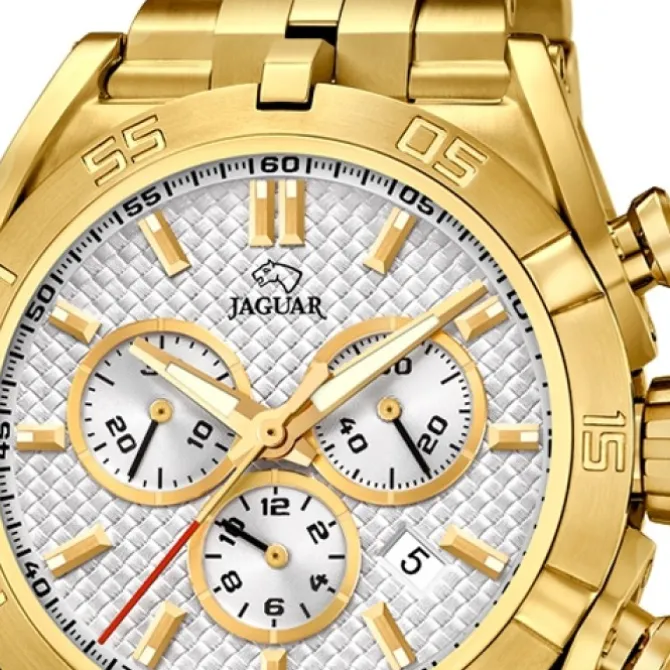 Diese Sport-Uhr für Herren, ausgestattet mit einem hochwertigen Edelstahl-Armband in gold, kommt aus der exklusiven Jaguar Kollektion Executive. Die Analoguhr zeichnet sich insbesondere durch ein höchst präzises Quarzwerk aus und ist bis 10 bar wasserdicht.