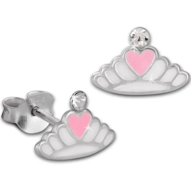 Teenie-Weenie Kinder Ohrstecker Krone mit Herz mit weißer Emaille und kleinen weißen Zirkonias aus unserer Kinderschmuck Kollektion aus anlaufgeschütztem 925 Sterling Silber. Die Kristalle funkeln und glitzern auf dem Ohrring.