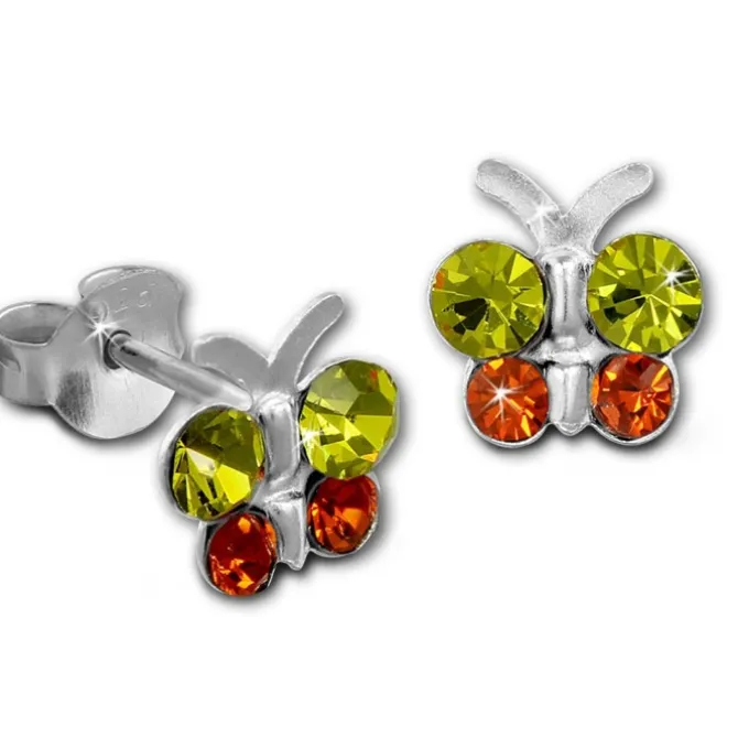 Teenie-Weenie Kinder Ohrstecker Schmetterling mit kleinen gelben und orangen Zirkonias aus unserer Kinderschmuck Kollektion aus anlaufgeschütztem 925 Sterling Silber. Die Kristalle funkeln und glitzern auf dem Ohrring.