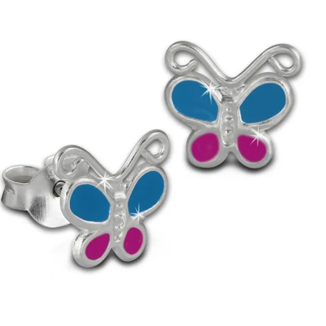 Teenie-Weenie Kinder Ohrstecker kleiner Schmetterling mit hellblauer und rosa Emaille aus unserer Kinderschmuck Kollektion aus anlaufgeschütztem 925 Sterling Silber.