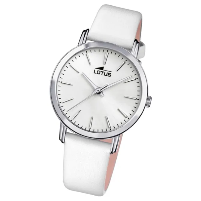 Diese Fashion Uhr für Damen aus der exklusiven Lotus Trendy-Kollektion verfügt über ein hochwertiges Leder-Armband in weiß. Das analoge Quarzwerk und die Wasserdichte bis 5 bar machen diese Armbanduhr zu einem besonders zuverlässigen Begleiter.
