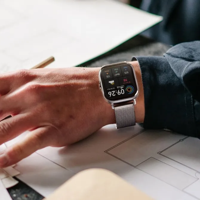 - Funktionen: Smartwatchfunktionen, Uhrzeit, Stoppuhr, Alarm, Datum, 24h-Anzeige