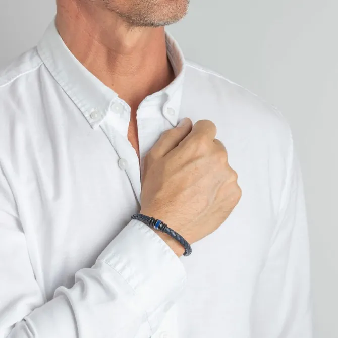 Ein Armband aus der Lotus Style Urban Kollektion für Herren aus Leder mit Karabinerverschluss. Der blaue Armschmuck von Lotus Style hat die Bestellnummer JLS1814-2-1
