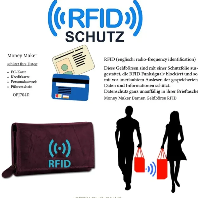 Trendige Leder Geldbörse mit Money Maker Schriftzug. Portemonnaie mit vielen Fächern für beste Sortierung in schöner Optik, sehr gut verarbeitet. Diese Damen Brieftasche in Form einer Kellnerbörse ist in mehreren Farben erhältlich. Zusätzlich ist es mit einem RFID Blocker ausgestattet, so bietet sie Sicherheit für unerlaubtes auslesen Ihrer Daten. Im Lieferumfang enthalten ist ein kleiner Fee-Anhänger, der am Produkt oder auch als Handyanhänger getragen werden kann.