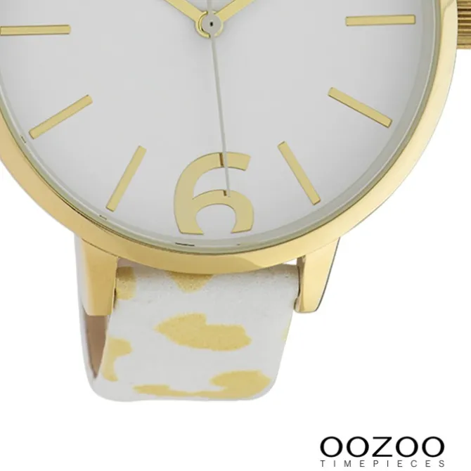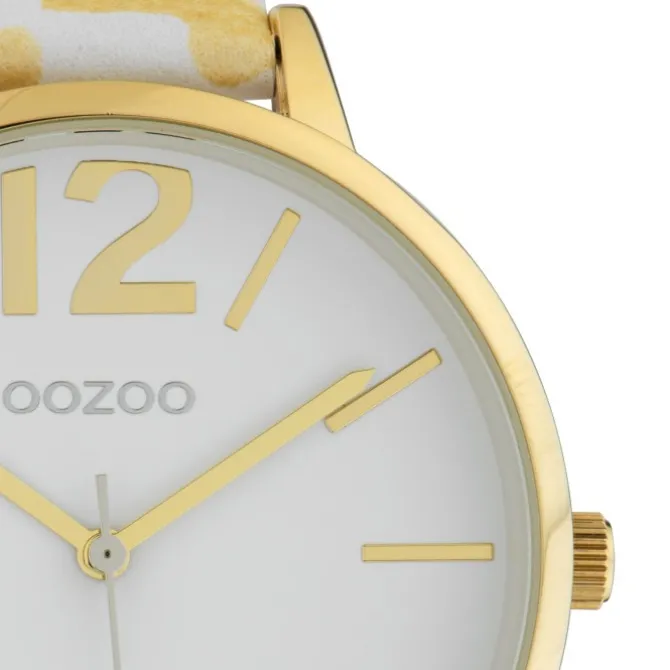 Diese Fashion Uhr für Damen aus der exklusiven Oozoo Oozoo Timepieces-Kollektion verfügt über ein hochwertiges Leder-Armband in weiß und gelb. Das Gehäuse der Uhr ist groß (ca. 43mm). Das analoge Uhrwerk und das Uhrenglas aus Mineralglas machen diese Armbanduhr zu einem hochwertigen und modischen Begleiter.