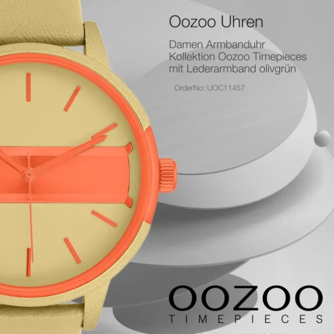 Die Casual Uhr für Damen aus der exklusiven Oozoo Timepieces-Kollektion hat ein hochwertiges Leder-Armband in olivgrün. Das Gehäuse der Uhr ist groß (ca. 42mm). Das analoge Uhrwerk und das Uhrenglas aus Mineralglas machen diese Armbanduhr zu einem schönen und modischen Accessoire.