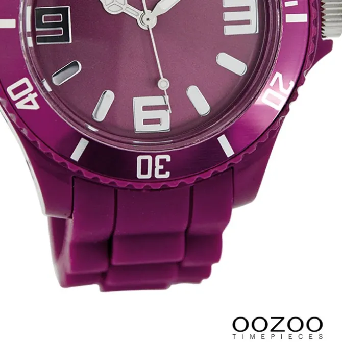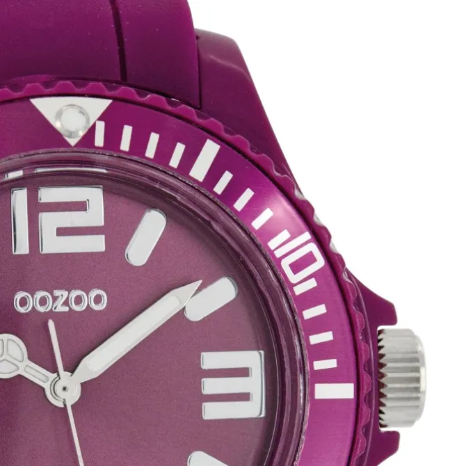 Diese Fashion Uhr für Damen aus der exklusiven Oozoo Oozoo Timepieces-Kollektion verfügt über ein hochwertiges Silikon-Armband in lila. Das Gehäuse der Uhr ist groß (ca. 43mm). Das analoge Uhrwerk und das Uhrenglas aus Mineralglas machen diese Armbanduhr zu einem hochwertigen und modischen Begleiter.