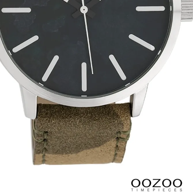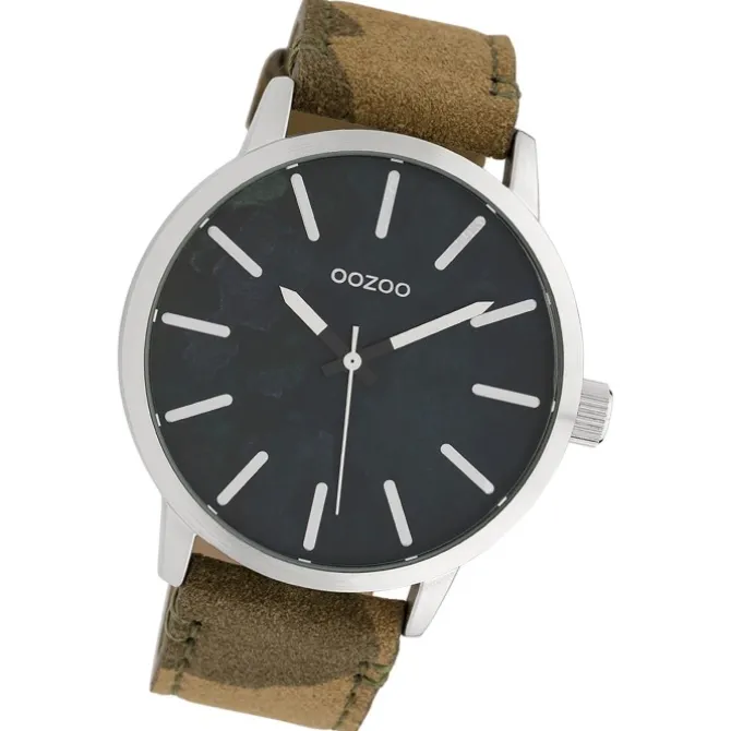 Diese Fashion Uhr für Damen und Herren aus der exklusiven Oozoo Oozoo Timepieces-Kollektion verfügt über ein hochwertiges Leder-Armband in camouflage und dunkelgrün. Das Gehäuse der Uhr ist groß (ca. 45mm). Das analoge Uhrwerk und das Uhrenglas aus Mineralglas machen diese Armbanduhr zu einem hochwertigen und modischen Begleiter.