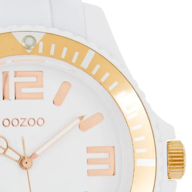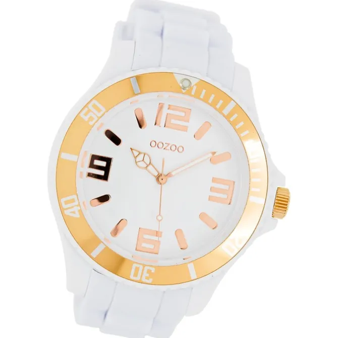 Diese Fashion Uhr für Damen und Herren aus der exklusiven Oozoo Oozoo Vintage Series-Kollektion verfügt über ein hochwertiges Silikon-Armband in weiß. Das Gehäuse der Uhr ist extra groß (ca. 48mm). Das analoge Uhrwerk und das Uhrenglas aus Mineralglas machen diese Armbanduhr zu einem hochwertigen und modischen Begleiter.