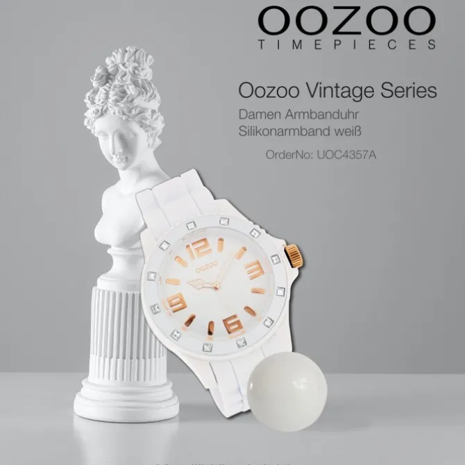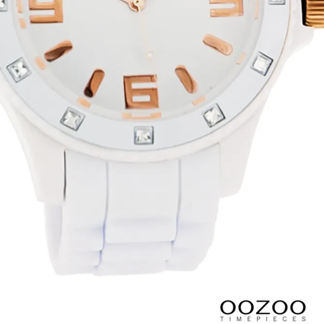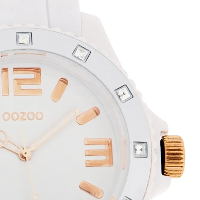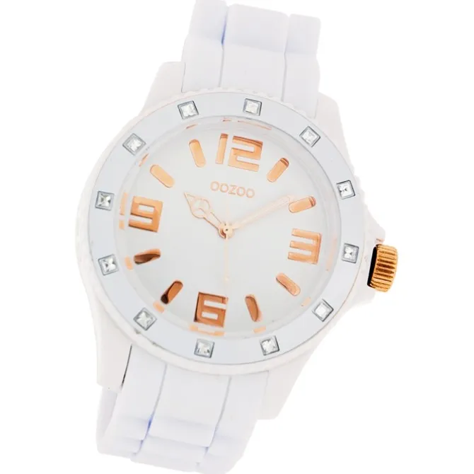 Diese Fashion Uhr für Damen und Herren aus der exklusiven Oozoo Oozoo Vintage Series-Kollektion verfügt über ein hochwertiges Silikon-Armband in weiß. Das Gehäuse der Uhr ist groß (ca. 43mm). Das analoge Uhrwerk und das Uhrenglas aus Mineralglas machen diese Armbanduhr zu einem hochwertigen und modischen Begleiter.