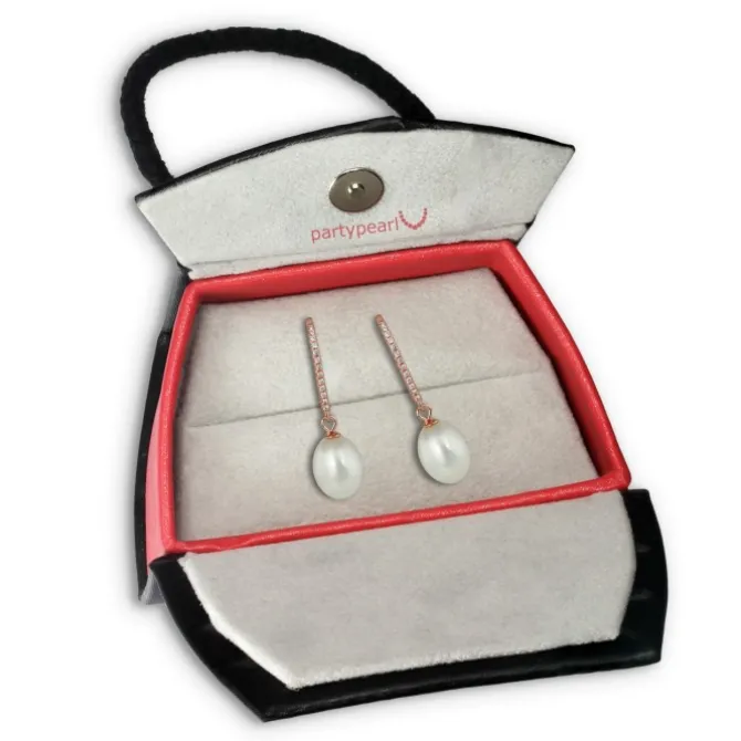 Ein edles Geschenk Set – Perlenohrhänger rosevergoldet & Schmucktasche schwarz/rot – aus unserer einzigartigen PartyPearl Kollektion. Dieses rosevergoldete Schmuckset ist aus anlaufgeschütztem 925 Sterling Silber, die Perlen-Ohrringe sind aus weißen Süßwasserzuchtperlen mit weißen Zirkonias. Die dazu gehörige Schmuckverpackung ist in Form einer kleinen Handtasche.
