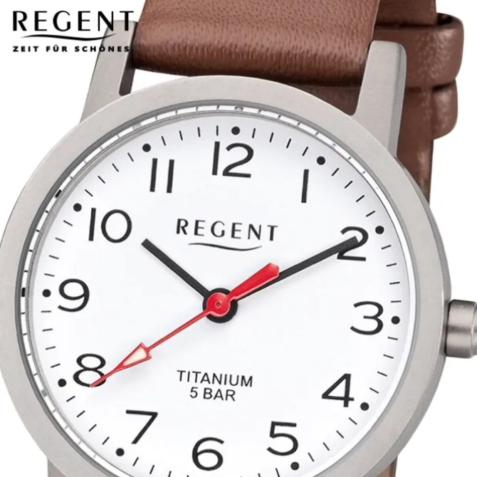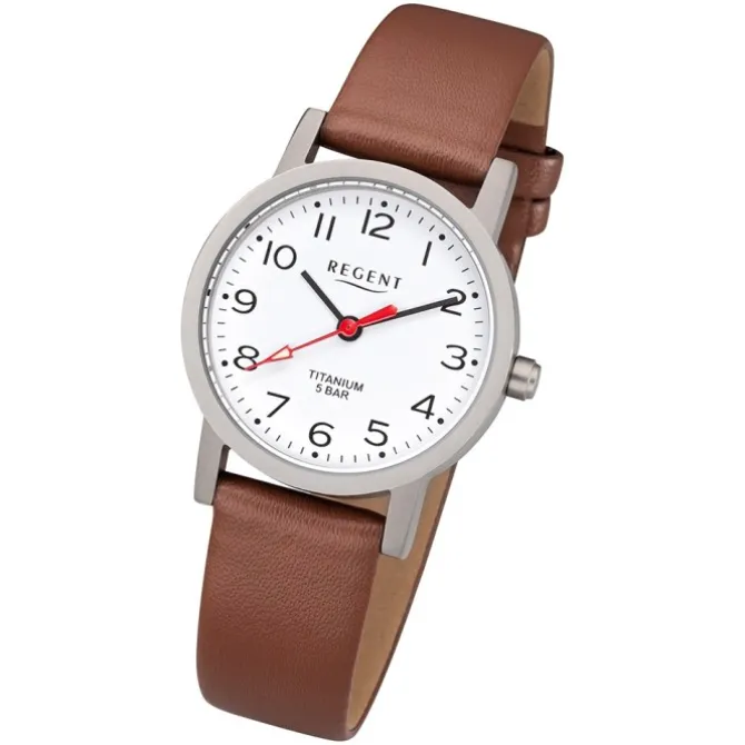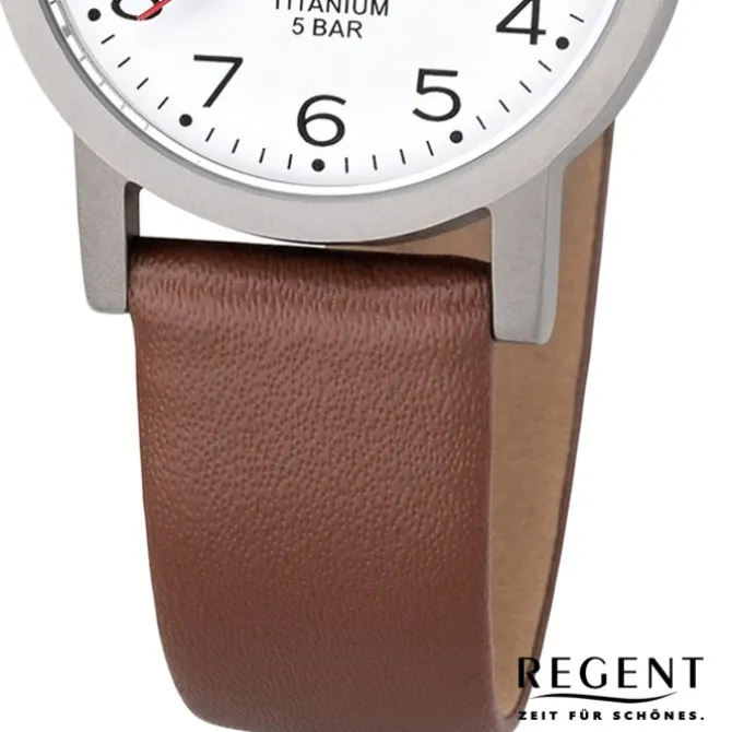 Diese elegante Uhr für Damen aus der exklusiven Regent Titan-Uhren-Kollektion verfügt über ein hochwertiges Leder-Armband in braun. Das analoge Quarzwerk und die Wasserdichte bis 5 bar machen diese Armbanduhr zu einem besonders zuverlässigen Begleiter.