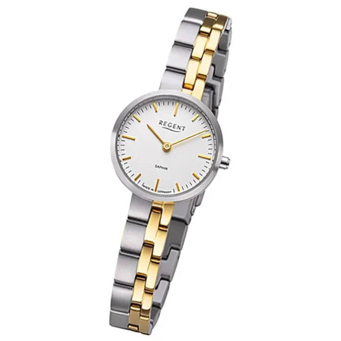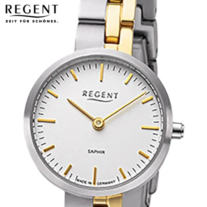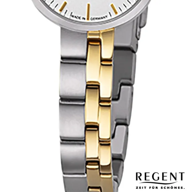 Diese elegante Uhr für Damen aus der exklusiven Regent Titan-Uhren-Kollektion verfügt über ein hochwertiges Titanband-Armband in bicolor. Das analoge Quarzwerk und die Wasserdichte bis 5 bar machen diese Armbanduhr zu einem besonders zuverlässigen Begleiter.