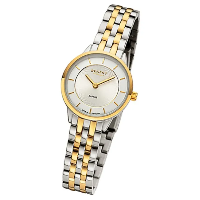 Diese elegante Uhr für Damen aus der exklusiven Regent Metallarmband-Kollektion verfügt über ein hochwertiges Metallband-Armband in bicolor. Das analoge Quarzwerk und die Wasserdichte bis 5 bar machen diese Armbanduhr zu einem besonders zuverlässigen Begleiter.