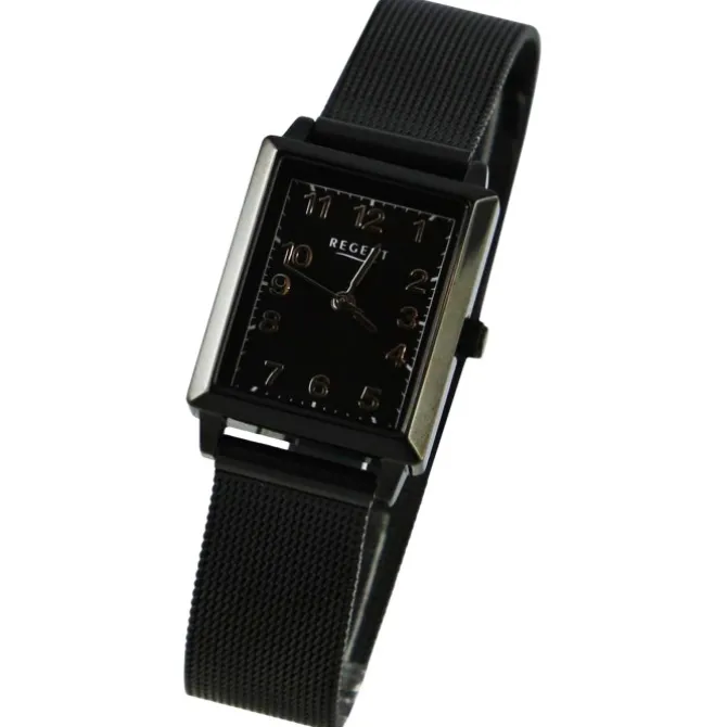 Diese Casuale Armbanduhr für Damen ist aus der exklusiven Regent Metallarmband-Kollektion. Sie hat ein hochwertiges Metall-Armband in schwarz. Das Gehäuse der Uhr ist extra groß (ca. 22x26mm). Das analoge Uhrwerk und das Uhrenglas aus Mineralglas machen diese Armbanduhr zu einem hochwertigen und modischen Begleiter.