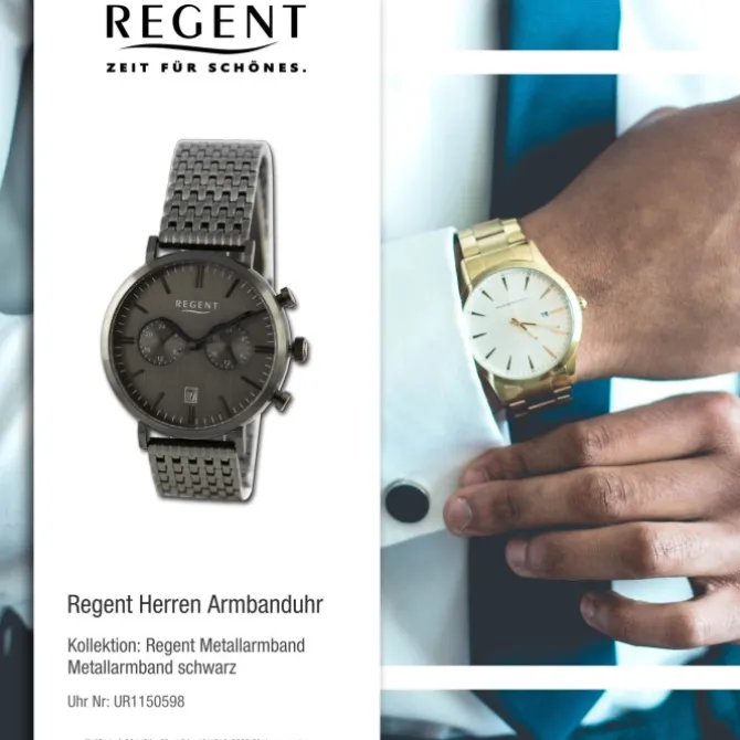 Die Regent Metallarmband-Kollektion bietet zeitgemäßes Design und Robustheit in einem. Diese Uhren sind perfekte Begleiter für jeden Anlass mit ihrem modernen Look und langlebigen Material.