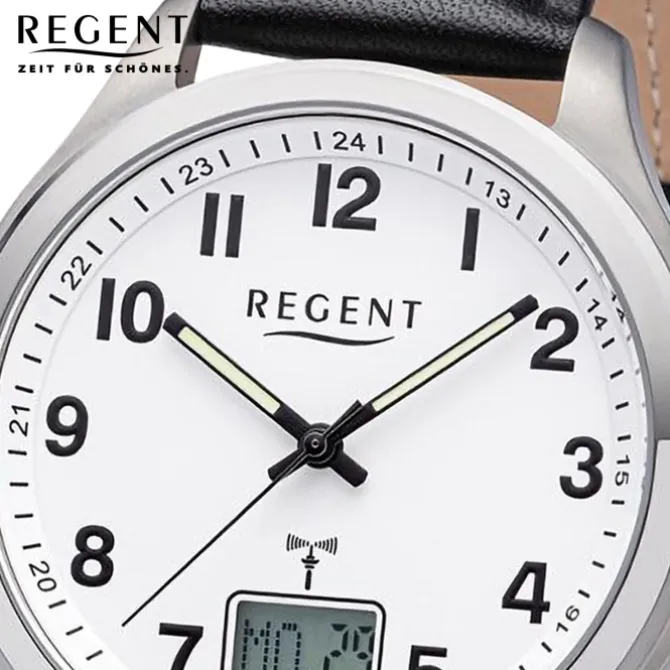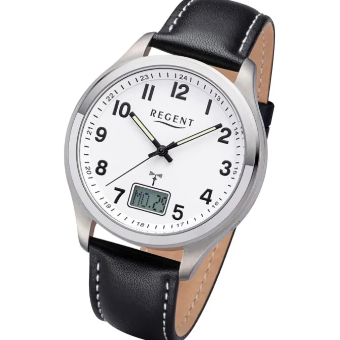 Diese Luxuse Funkuhr für Herren ist aus der exklusiven Regent Lederarmband-Kollektion. Sie hat ein hochwertiges Leder-Armband in schwarz. Das Gehäuse der Uhr ist extra groß (ca. 42mm). Das Uhrwerk und das Uhrenglas aus Mineralglas machen diese Funkuhr zu einem hochwertigen und modischen Begleiter.