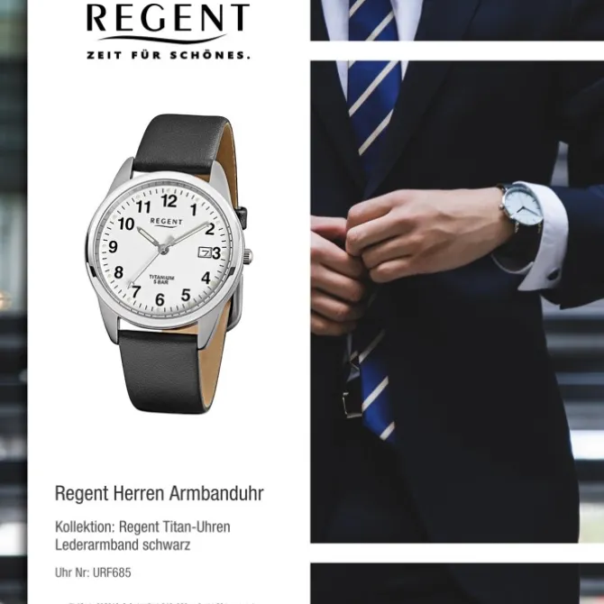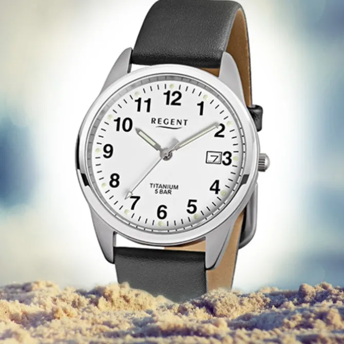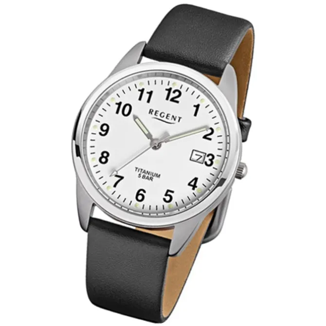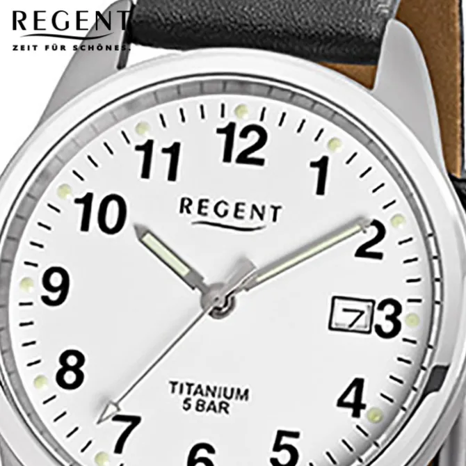 - Kurzbeschreibung: Regent Herren Titan Armbanduhr Quarzwerk Lederarmband schwarz URF685