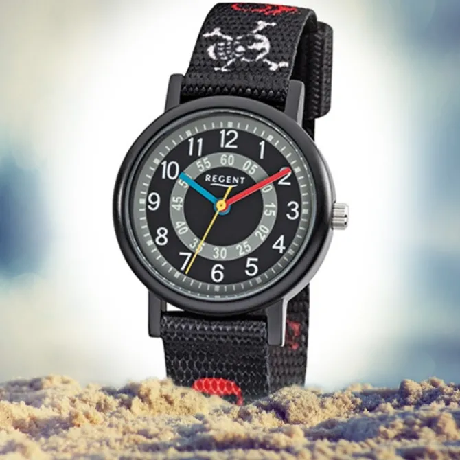 - Kurzbeschreibung: Regent Kinder Piratenuhr Aluminium Textil schwarz rot weiß Jungen Uhr URF950