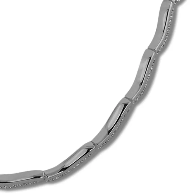 Eine moderne Collier Halskette Welle Zirkonia weiß in der Länge 44cm mit Karabinerverschluss. Die Kette ist aus der einzigartigen SilberDream Schmuck Kollektion und aus allergenfreiem und poliertem 925 Sterling Silber. Jedes Glied ist glänzend und mit vielen kleinen Zirkonias verziert, die auf der Kette weiß funkelnden. Diese Halskette ist auch im Set (mit Armband) erhältlich.