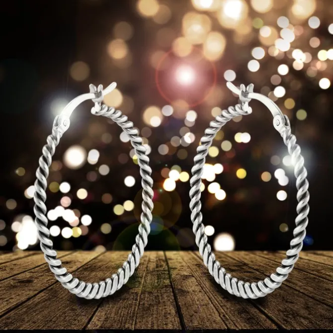 Ein Paar moderne Creolen Zopfmuster mit einem Durchmesser von ca. 3cm. Die Ohrringe haben einen gedrehten Oberfläche die zu Mitte dann abgeflacht ist. Diese Damenohrringe sind aus unserer einzigartigen SilberDream Schmuck Kollektion und aus 925er Sterling Silber.