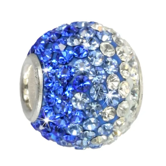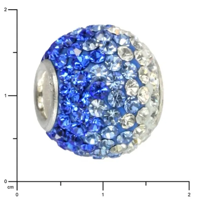 Ein Bead mit Zirkonias Kristallen – mit Zirkonias Kristallen blau Ice – mit 925 Silber Kern für Bettelarmband oder Halskette. Das Bead ist im European Bead Stil gefertigt. Die Zirkonias erstrahlen auf dem Bead im ICE Farbverlauf.