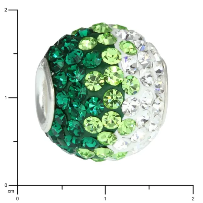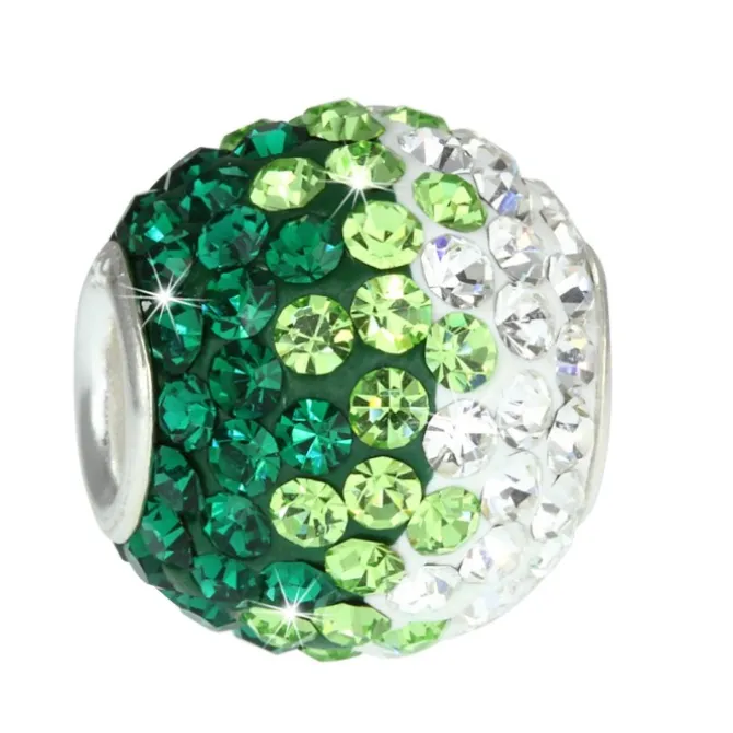Ein Bead mit Zirkonias Kristallen – mit Zirkonias Kristallen grün Ice – mit 925 Silber Kern für Bettelarmband oder Halskette. Das Bead ist im European-Beads Stil gefertigt. Die Zirkonias erstrahlen auf dem Bead im ICE Farbverlauf.