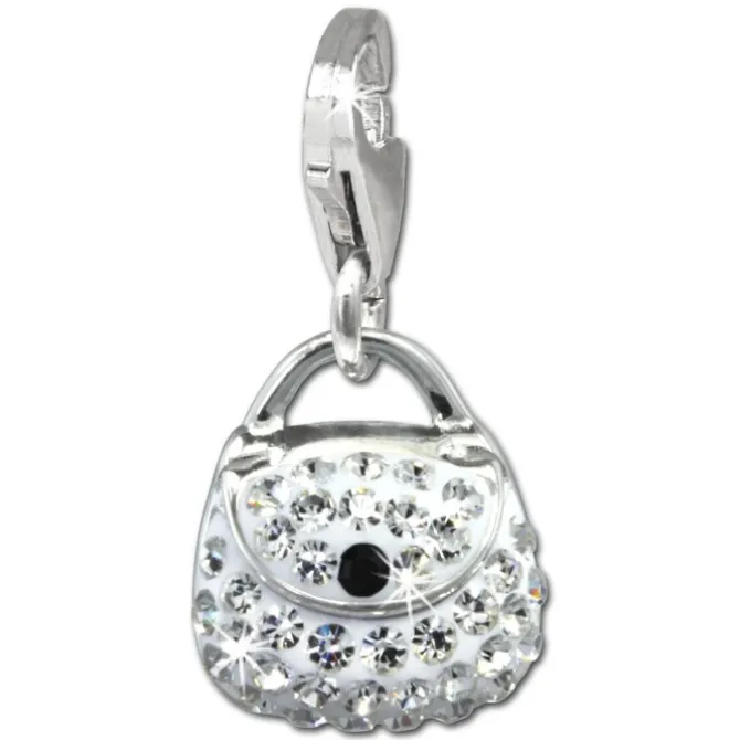 – Tasche klein weiß – ein Glitzer Charm mit tschechischen Kristallen und aus 925 Sterling Silber für Bettelarmband oder Halskette. Der funkelnde Anhänger passt auch an Armbänder anderer Hersteller oder kann als Kettenanhänger oder Anhänger für ein Handy genutzt werden. Die Zirkonia Kristalle erstrahlen auf dem Charm in der Farbe weiß.