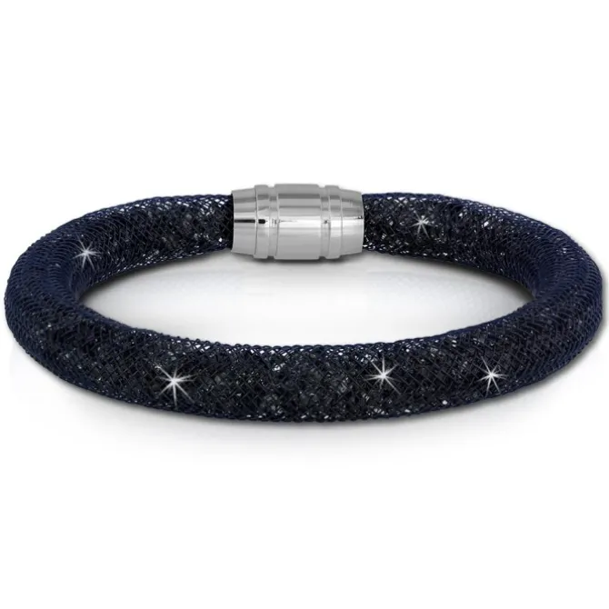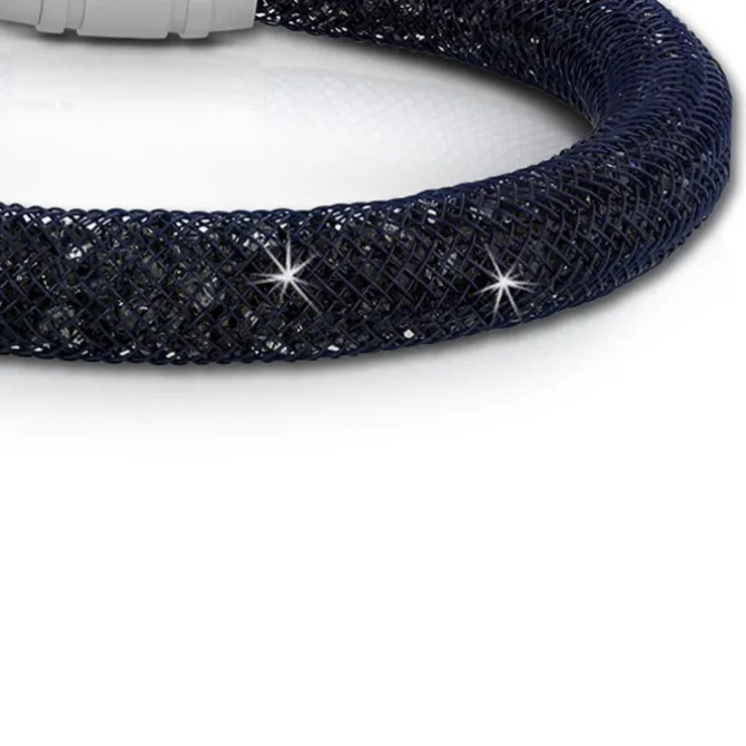 Das Armband passt für einen Armumfang bis zu ca. 20cm. Es besteht aus einem dunkelblauen Nylon-Netzschlauch, das mit vielen kleinen graublauen Kristallen gefüllt ist. Das 3D Armband hat einen sehr starken und polierten Edelstahl-Magnetverschluss.
