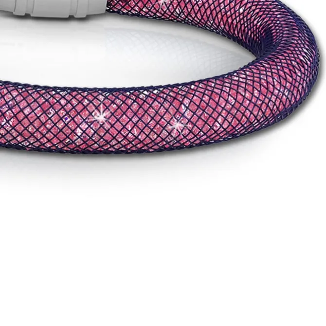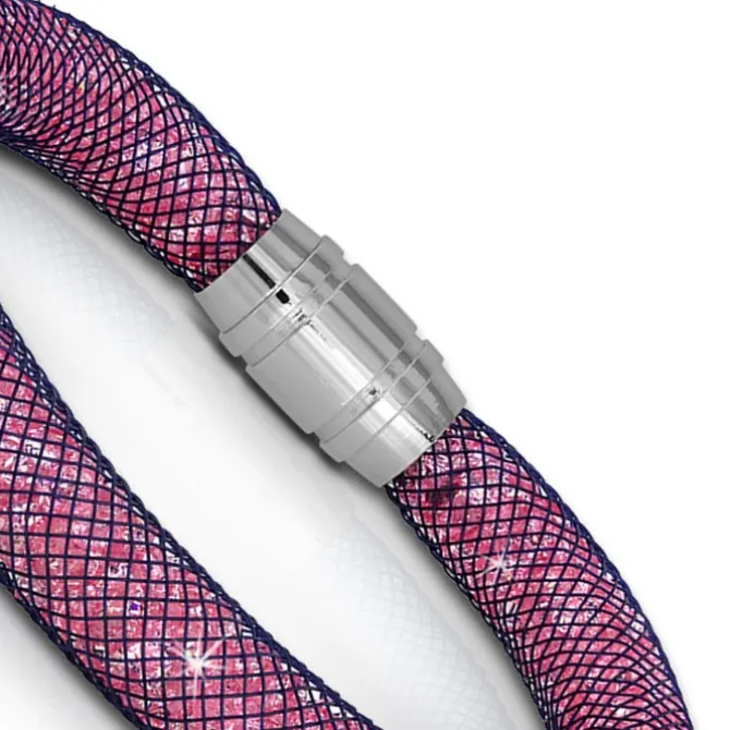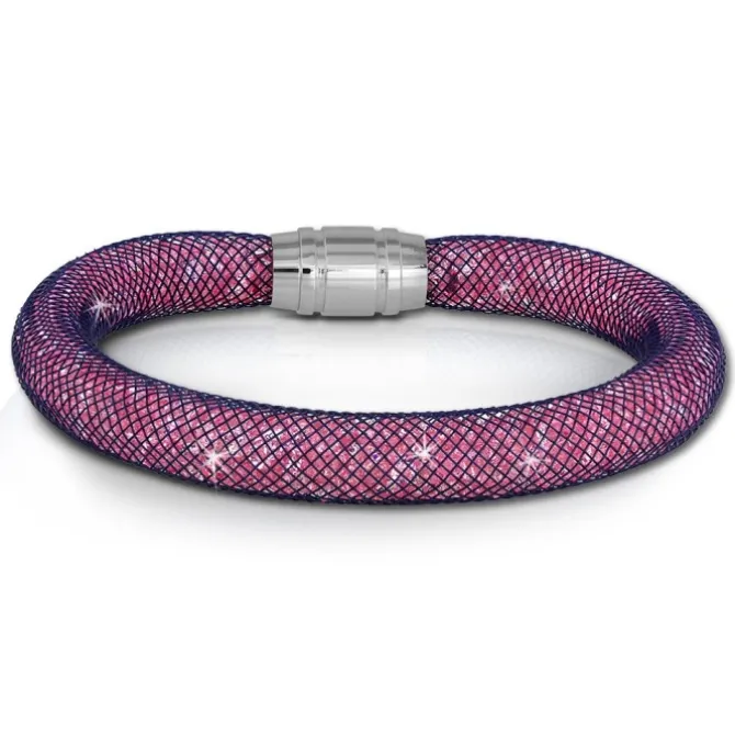 Das Armband passt für einen Armumfang bis zu ca. 18cm. Es besteht aus einem dunkelblauen Nylon-Netzschlauch, das mit vielen kleinen fliederfarbenen Kristallen gefüllt ist. Das 3D Armband hat einen sehr starken und polierten Edelstahl-Magnetverschluss.