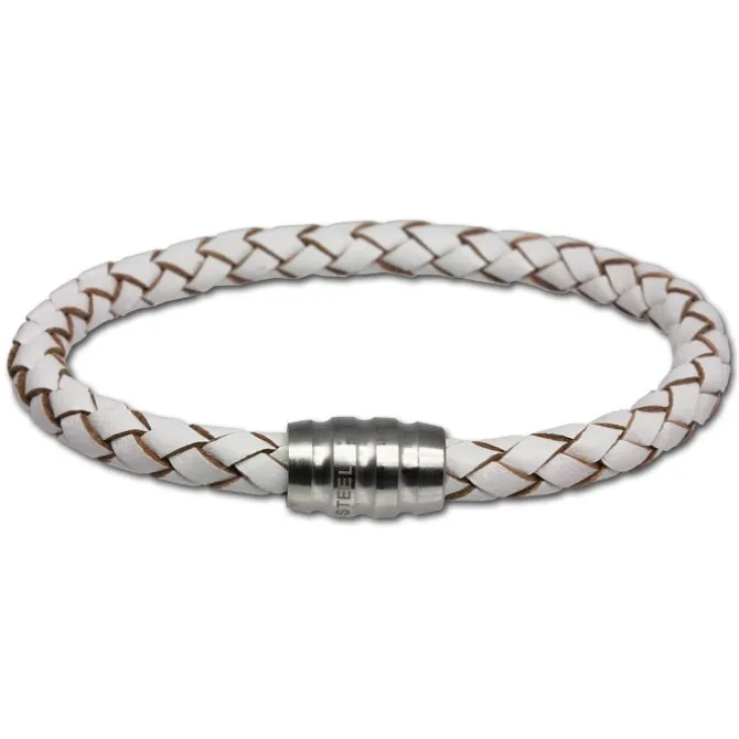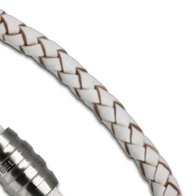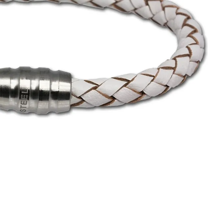 Ein geflochtenes Leder Armband in der Farbe weiß mit Stainless Steel Magnet Verschluss. Die Breite des Leder Bandes ist 5mm und die Länge ist 22cm.