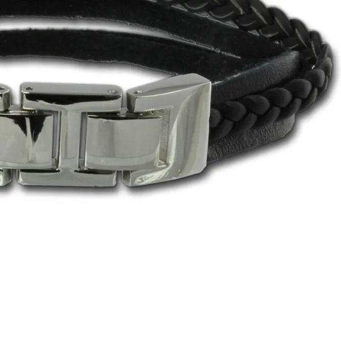Lederarmband schwarz mit Edelstahlverschluss und Zierkordeln. Das mittlere Verschluss-Glied lässt sich z.B. zur Größenanpassung entfernen.