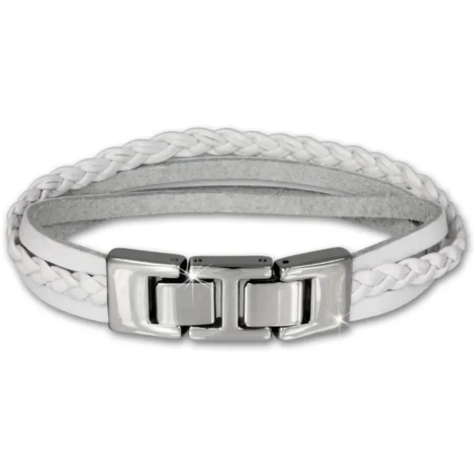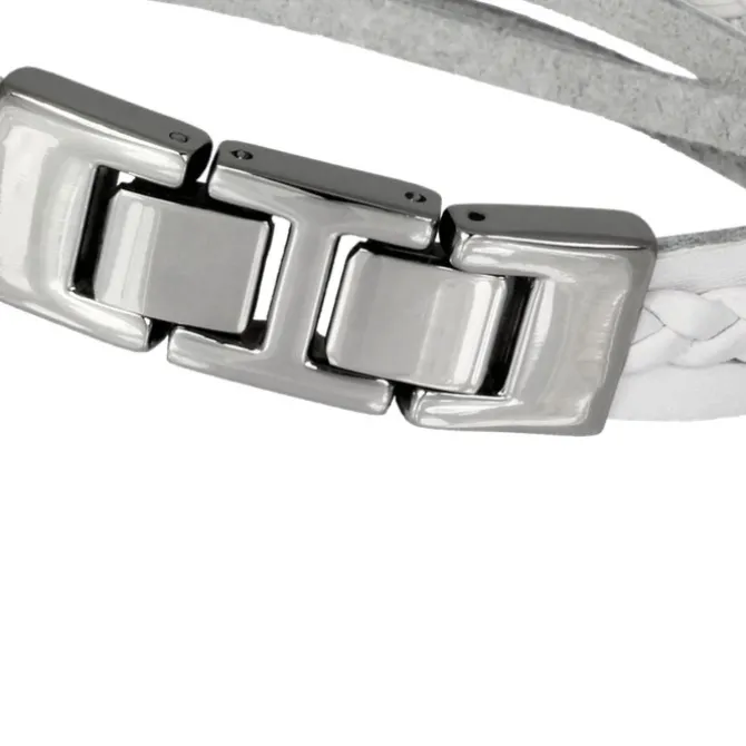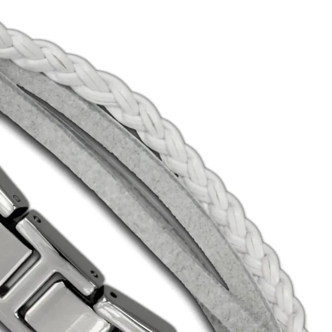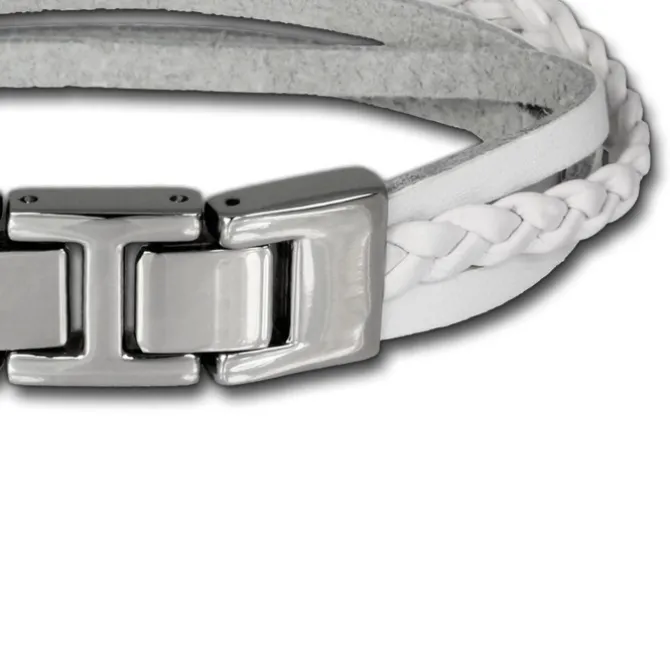 Lederarmband weiß mit Edelstahlverschluss und Zierkordeln. Das mittlere Verschluss-Glied lässt sich z.B. zur Größenanpassung entfernen.