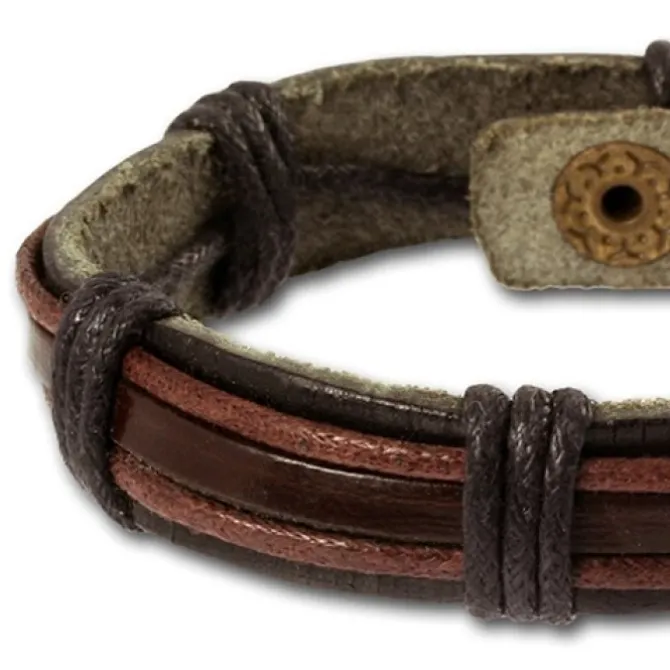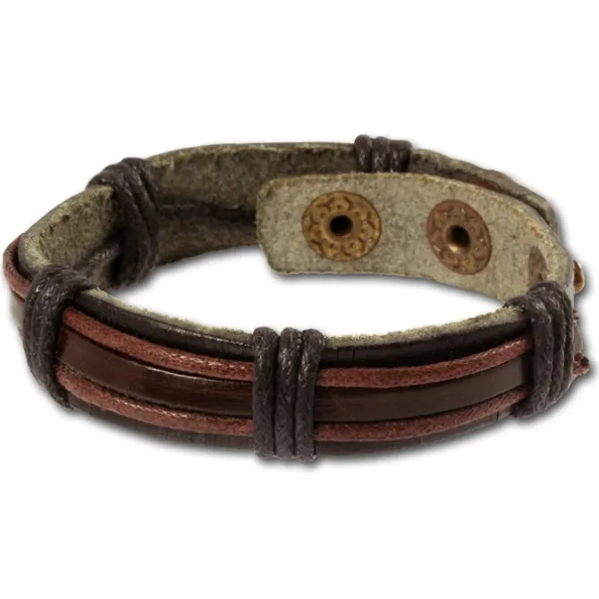 Herren Lederarmband schwarz mit braunen Kordeln und Druckknöpfen.