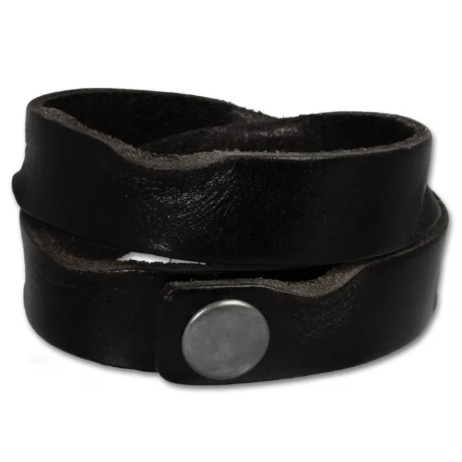 Lederarmband im used look schwarz. Das Armband hat zur Größenanpassung einen variablen Druckknopfverschluss und wird doppelt gewickelt getragen.