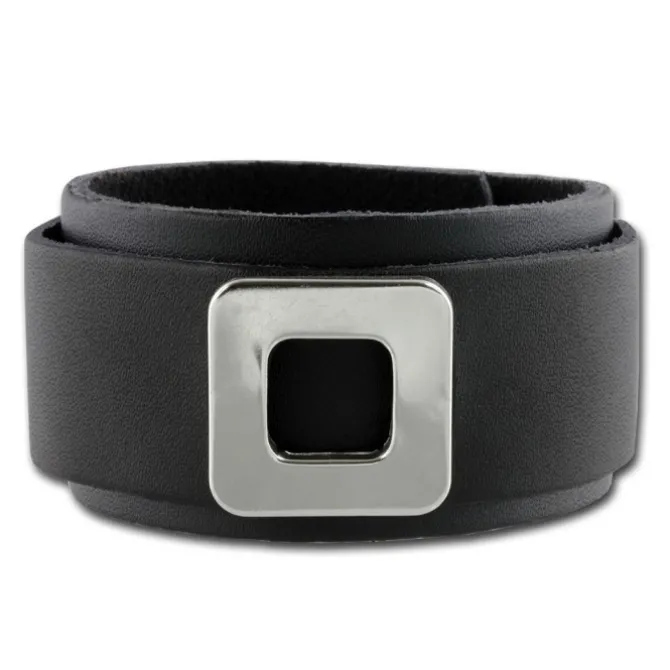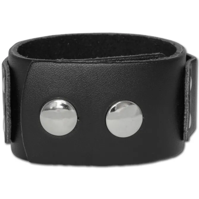 Unisex Lederarmband schwarz mit Edelstahl Verzierungen und einem Druckknopfverschluss.
