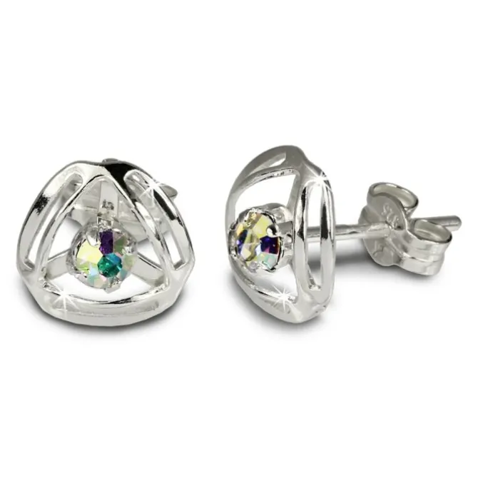 Ein Paar Ohrringe im Dreieck Design mit jeweils einem geschliffenen, funkelnden, kristallfarbenem Zirkonia. Die Ohrringe sind aus unserer einzigartigen SilberDream Kollektion und aus anlaufgeschütztem 925 Sterling Silber.