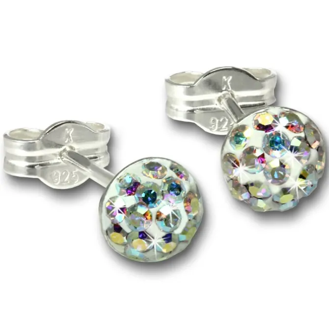 Ein Paar Ohrringe Halbkugel mit tschechischen Preciosa Kristallen – Ohrstecker Zirkonia kristall – aus 925 Sterling Silber. Die Glitzer Kristalle funkeln auf dem Ohrring im klaren Spektralfarben.