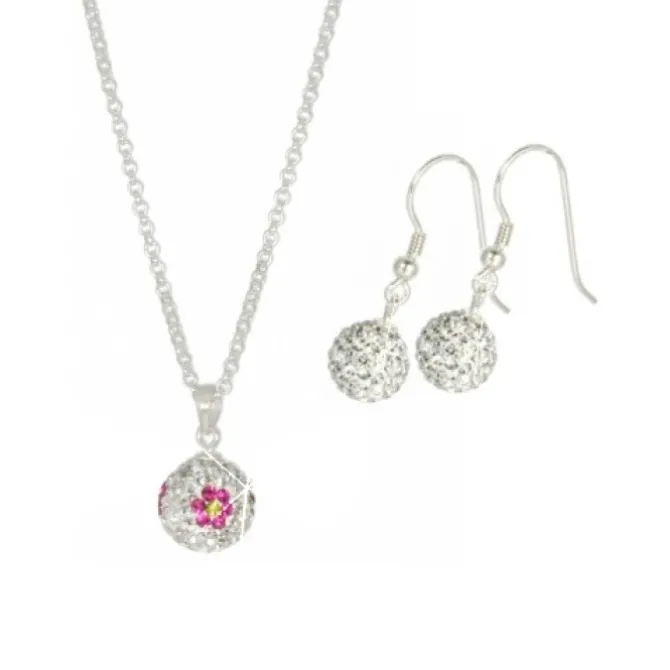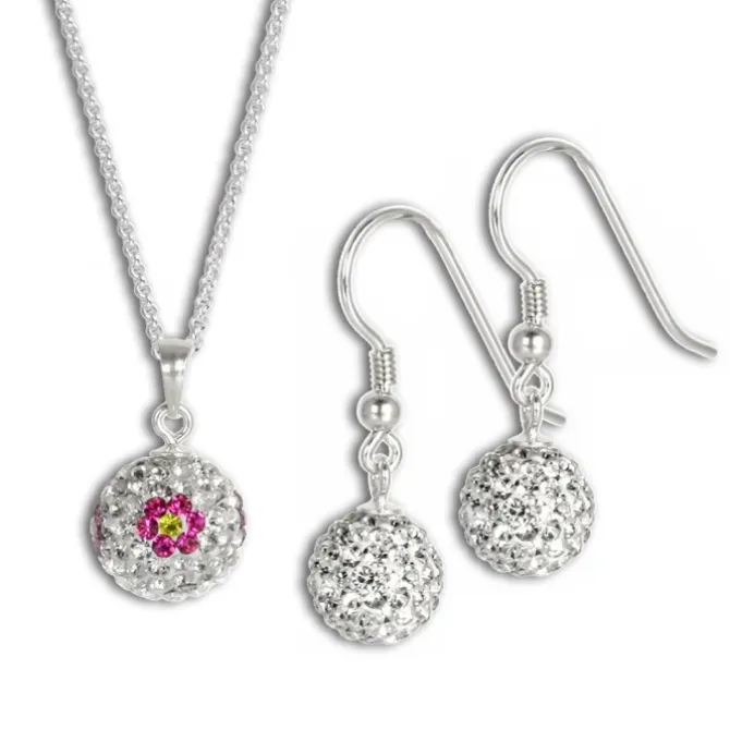 Eine Halskette mit einem Anhänger Blume pink aus Zirkonias Kristallen Shiny weiß und einem paar Ohrringe mit Zirkonias Kristallen in Shiny weiß. Kette, Anhänger und Ohrringe aus 925 Sterling Silber. Die Zirkonias funkeln auf dem Anhänger weiß mit einer pinkfarbenen Blume und die Ohrringe in klarem weiß.