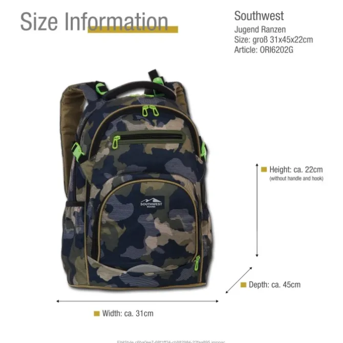 Dieser moderne Rucksack von Southwest aus der Hiking-Kollektion ist ein cooles Accessoire und ein praktischer Alltagsbegleiter für die Schule. Der Rucksack zeichnet sich durch sein sehr strapazierfähiges Material aus.