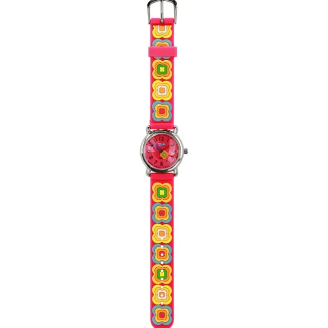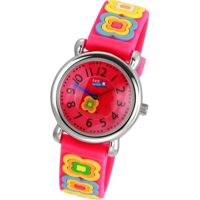 Kinder-Armbanduhr – Blumen – mit pinkem Kautschukarmband und pinkem Ziffernblatt aus der Tee-Wee Uhren Kollektion.