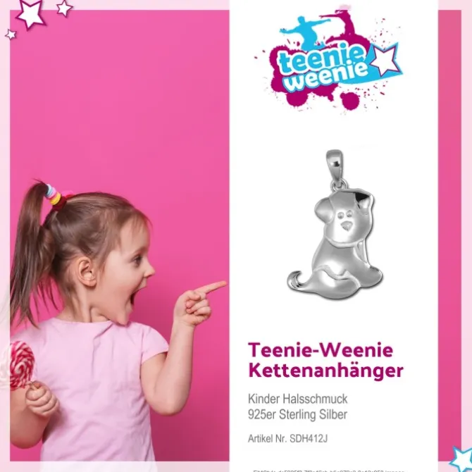 Ein Kinder Kettenanhänger Hündchen aus unserer einzigartigen Teenie-Weenie SilberDream Kollektion. Der Anhänger ist aus anlaufgeschütztem 925er Sterling Silber und passt an Ketten mit einem Duchmesser bis zu ca. 3mm. Wir haben die passende Kinderkette im Angebot, schauen sie einfach unter SDK01038. Im Set gibt es auch die passenden Ohrringe zu diesem Kettenanhänger.